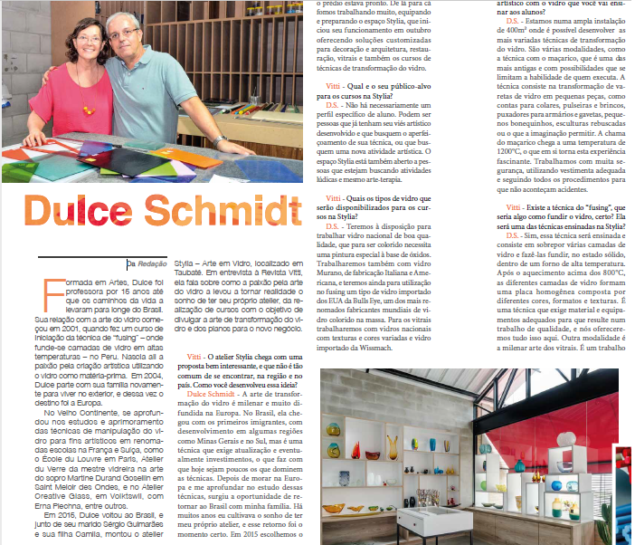 A artista plástica Dulce Schmidt concedeu entrevista exclusiva à Revista Vitti e contou detalhes sobre sua carreira, formação e bastidores do Ateliê Stylia, localizado em Taubaté e fundado em 2015. Dulce contou como a paixão pela arte do vidro a levou a tornar realidade o sonho de ter seu próprio ateliê, além de explicar como funciona a realização de cursos no seu empreendimento com o objetivo de divulgar a arte de transformação do vidro.